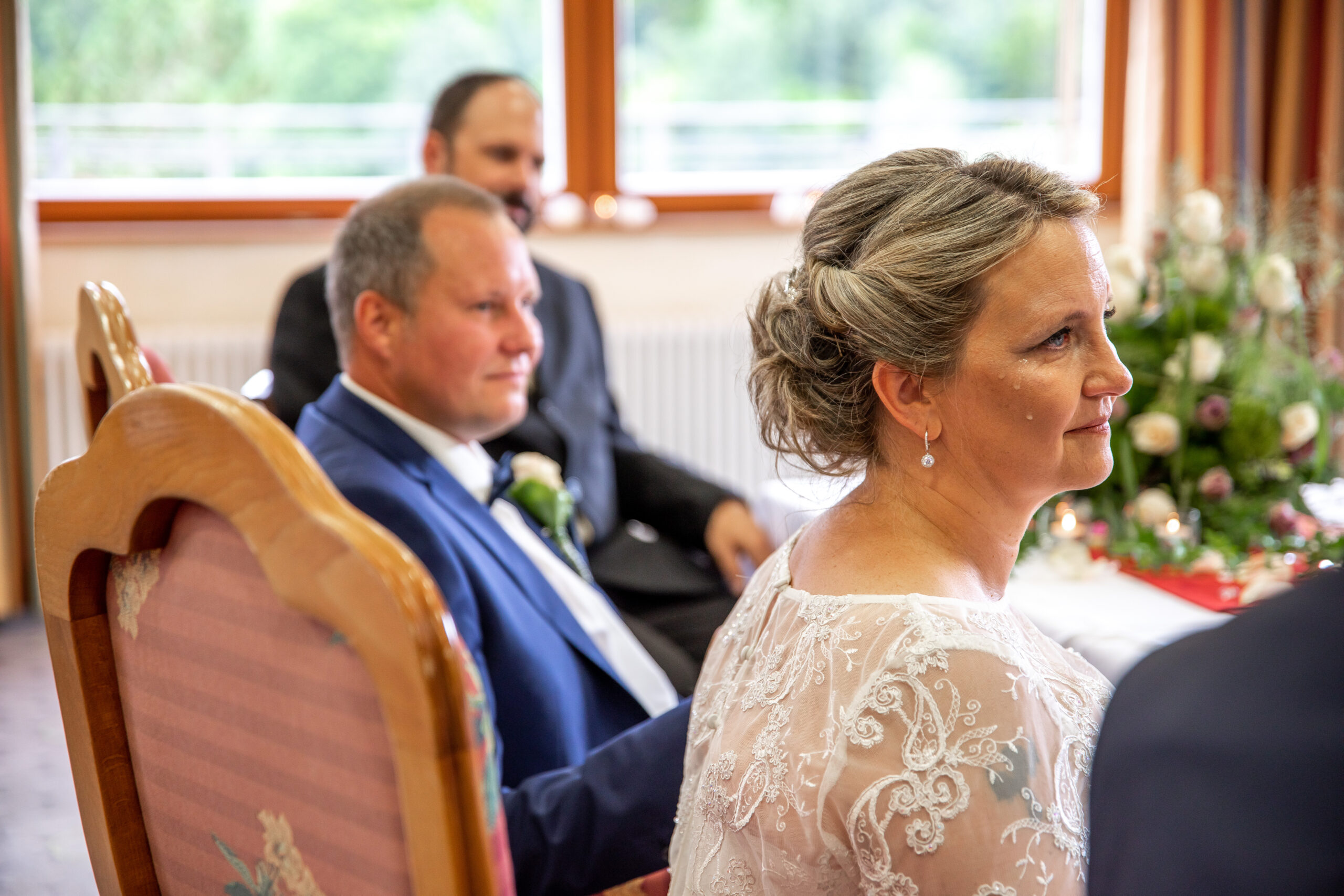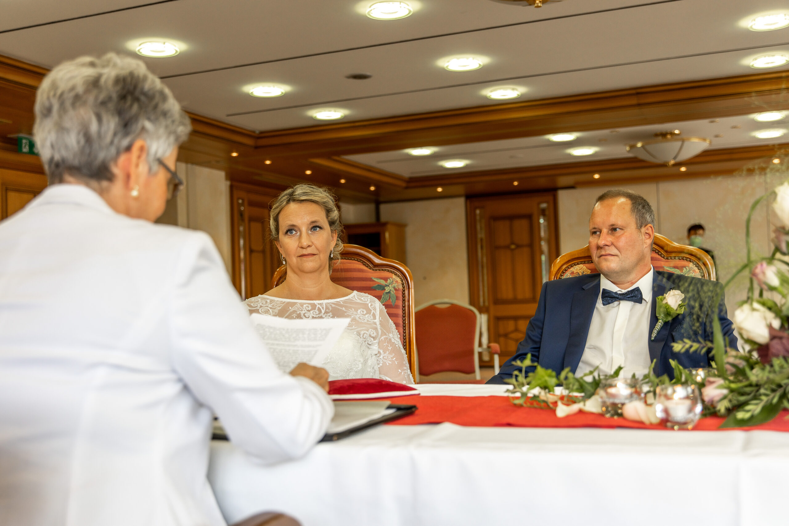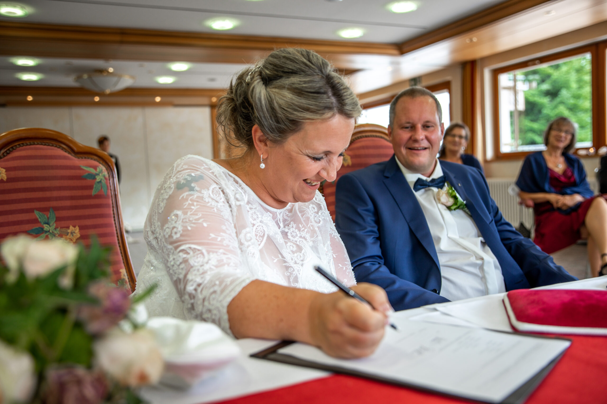 Die Eheringe für Nadine und Sascha wurden ihnen von ihrem süßen Hund überbracht, auf dessen Rücken die Ringe fixiert waren. Direkt nach dem Ringwechsel erfolgte eine weitere Überraschung, die das Brautpaar zu Tränen rührte. Die Standesbeamtin – eine Kollegin der Braut – sang zusammen mit dem Bürgermeister ein wunderschönes Liebeslied für das Hochzeitspaar. Dabei konnte Nadine ihre Emotionen nicht zurückhalten – Tränen, die die Emotionen dieses wundervollen Tages widerspiegeln und das Brautpaar sicherlich immer wieder an diesen tollen Tag zurückerinnern.