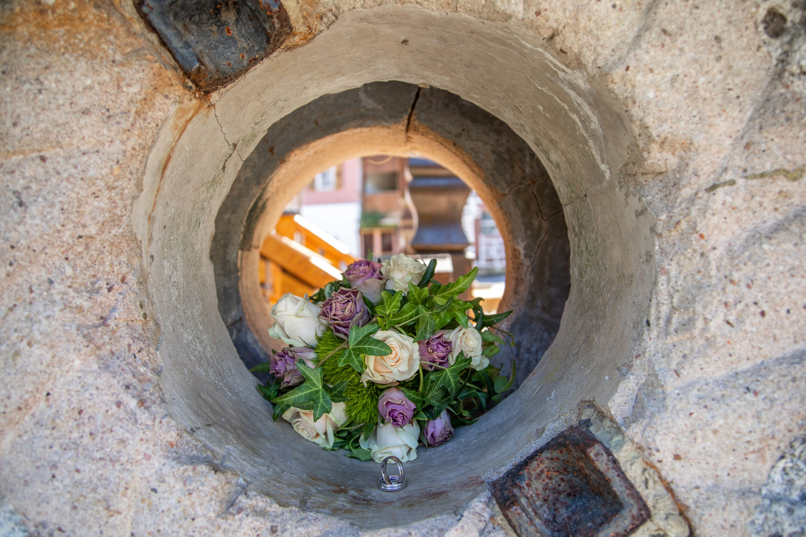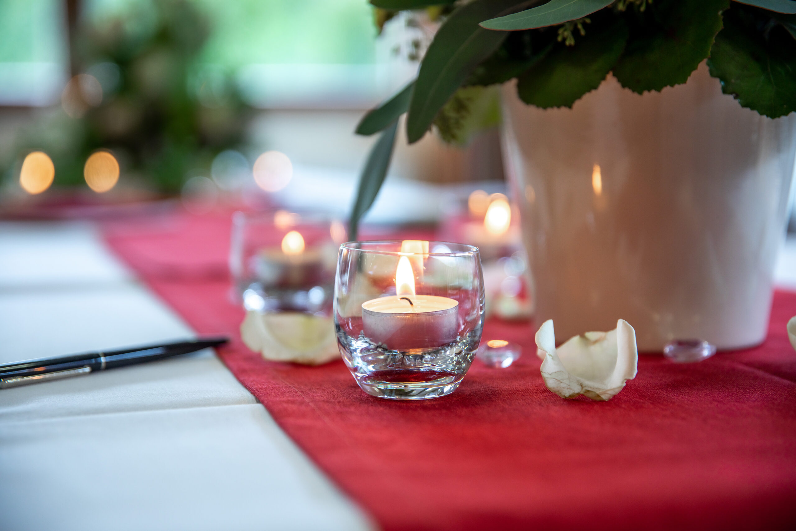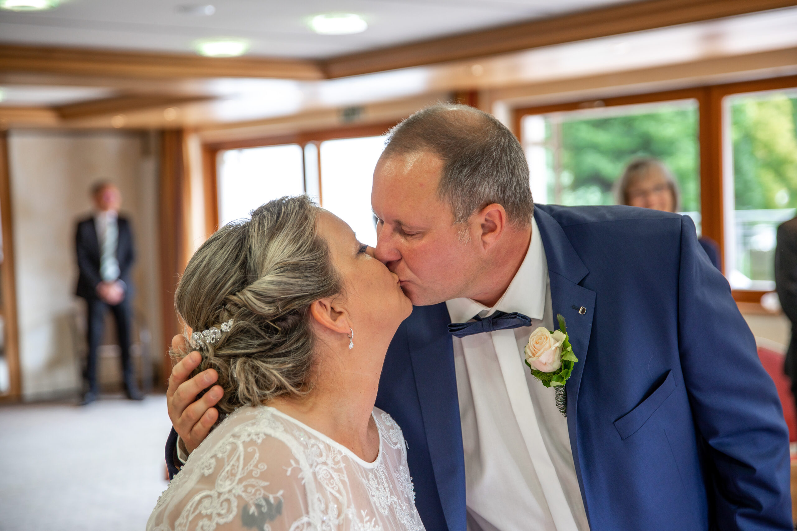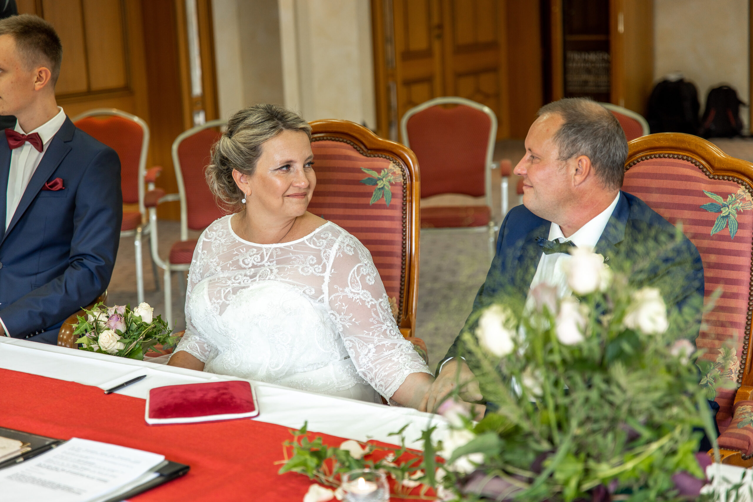 Die Eheringe für Nadine und Sascha wurden ihnen von ihrem süßen Hund überbracht, auf dessen Rücken die Ringe fixiert waren. Direkt nach dem Ringwechsel erfolgte eine weitere Überraschung, die das Brautpaar zu Tränen rührte. Die Standesbeamtin – eine Kollegin der Braut – sang zusammen mit dem Bürgermeister ein wunderschönes Liebeslied für das Hochzeitspaar. Dabei konnte Nadine ihre Emotionen nicht zurückhalten – Tränen, die die Emotionen dieses wundervollen Tages widerspiegeln und das Brautpaar sicherlich immer wieder an diesen tollen Tag zurückerinnern.