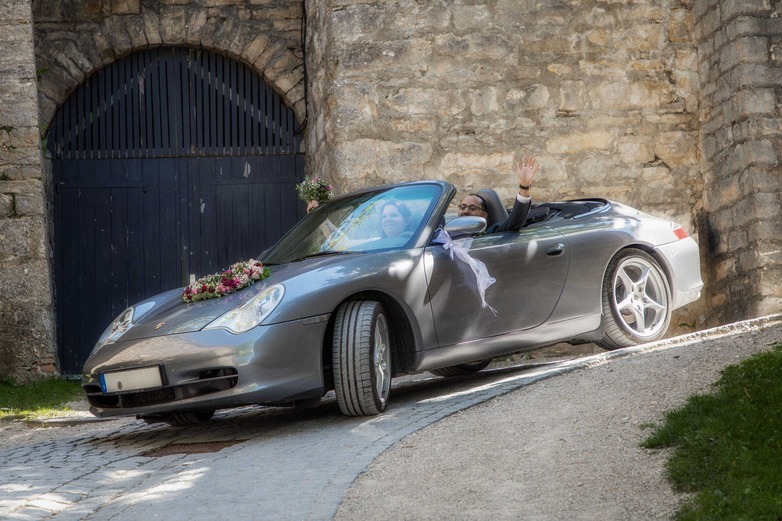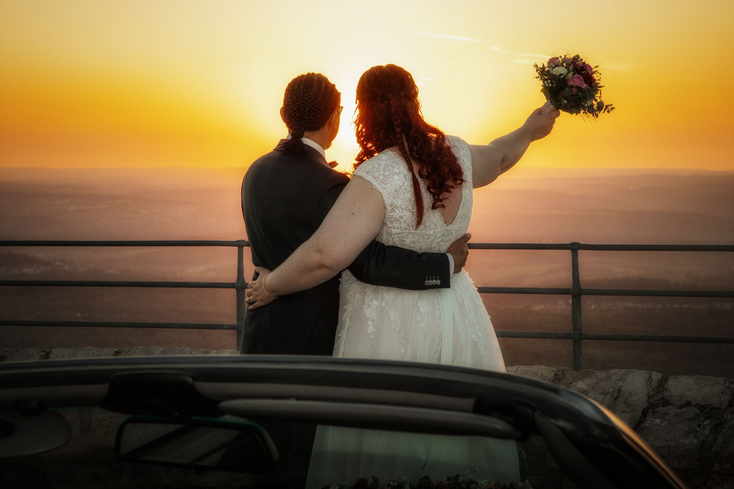 Gegen später hatten wir noch die Gelegenheit, für das Brautpaar ein Sunset-Fotoshooting auf der Burg Hohenneuffen anzufertigen. So konnten wir den Sonnenuntergang wunderbar in Szenen des Hochzeitspaars zusammen mit dem legendären Porschemodell einbinden.