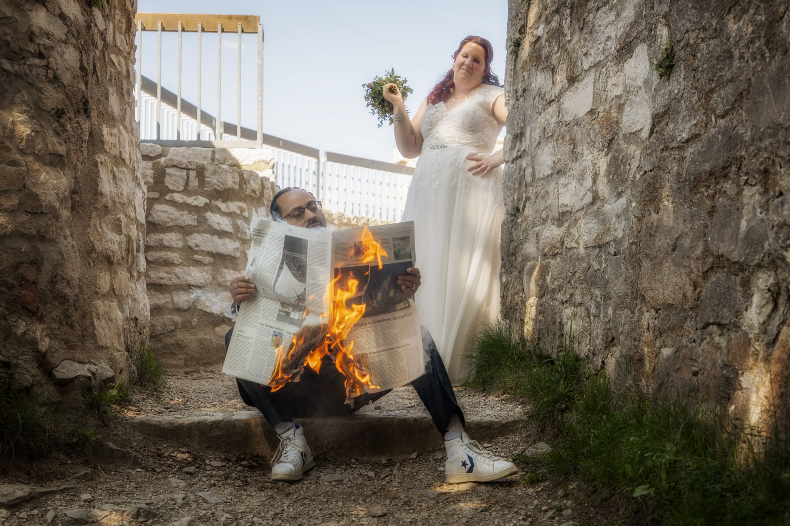 Bei Traumwetter fuhren Beide mit einem Porsche 911 vor. Ein wahnsinnig tolles Auto, das extra für den Tag geschmückt wurde. Den 911er haben wir natürlich auch bei den Brautpaarfotos eingebunden, die in purem Sonnenschein entstanden. Keine Sorge, die Szene mit der brennenden Zeitung hängt nicht mit dem Sonnenschein zusammen. Aber die passte so wunderbar zum Ort des Geschehens und zum Brautpaar, weshalb wir die Idee natürlich im Vorfeld mit den Betreibern vor Ort und mit dem Brautpaar abgestimmt haben.